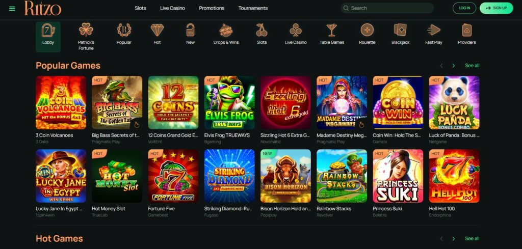 Medzi najobľúbenejšie kategórie hier v Ritzo Casino patrí sloty, ktoré sú plné vzrušenia a možností vyhrať veľké sumy peňazí. Hráči môžu nájsť hry s rôznymi témami a funkciami, ako sú progresívne jackpoty, bonusové kolá a ďalšie špeciálne funkcie, ktoré zvýrazňujú zábavu. Okrem automatov ponúka kasíno aj širokú škálu stolových hier, vrátane blackjacku, rulety, baccaratu a pokeru.